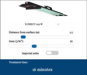 Se puede observar en la calculadora que radiando una dosis de (67 J/m2), bastaría con tan solo 16 minutos para 22m2 que son los m2 que cubre una lámpara, es por esto que en un ejemplo de aula de 40m2, se necesitarían 2 luminarias y un tiempo aproximado de 20 minutos.